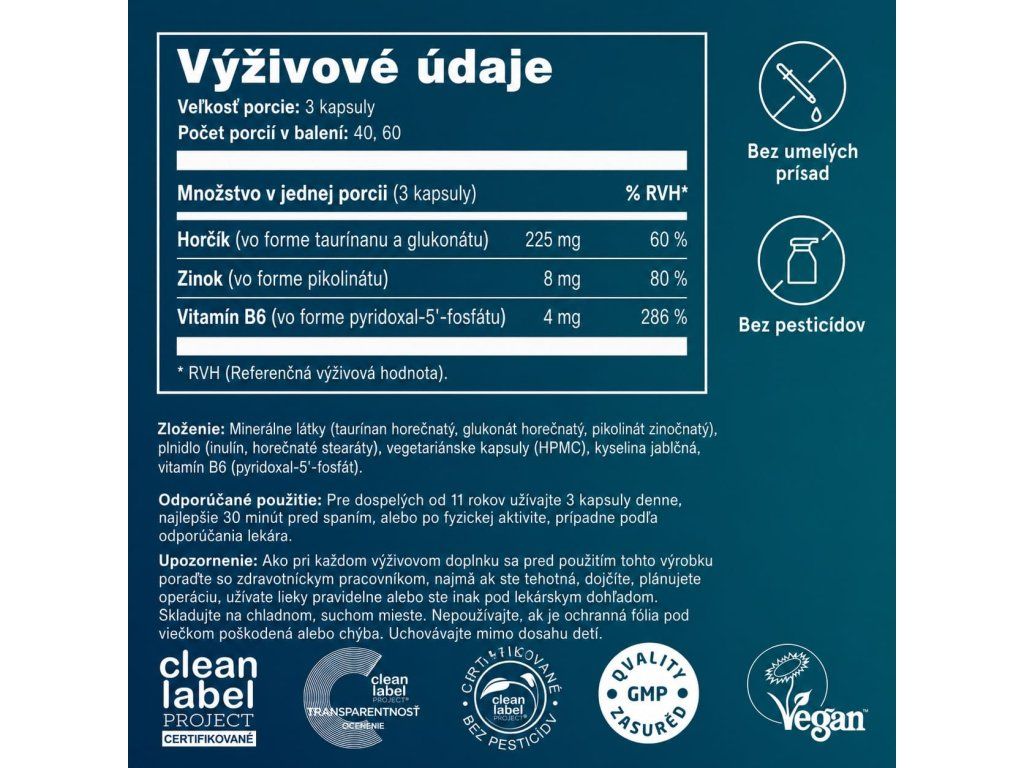 2. Magnézium taurinát – unikátne spojený horčík s aminokyselinou taurínom. Podporuje činnosť srdca, nervovej sústavy a má pozitívny vplyv na kvalitu spánku.